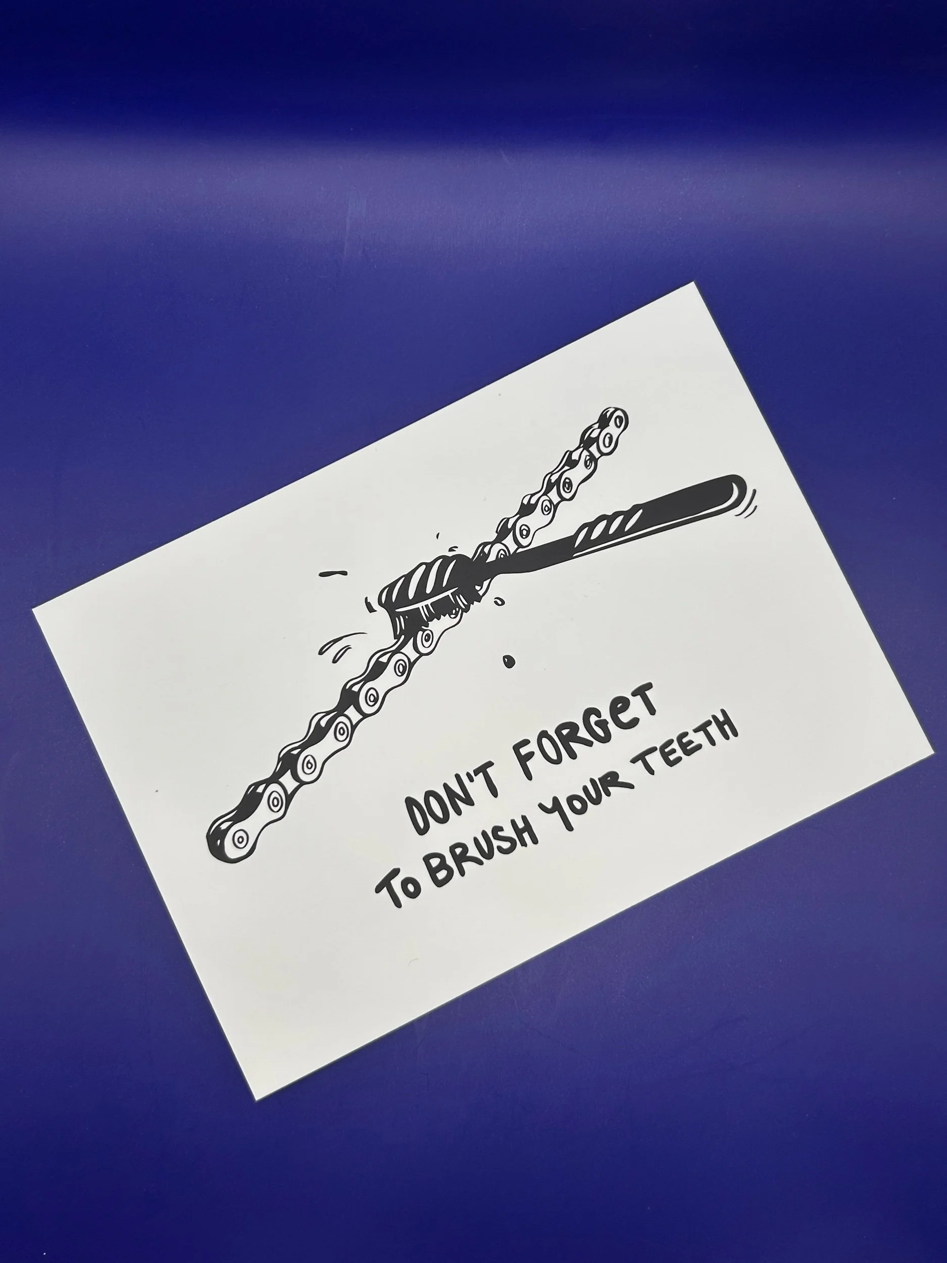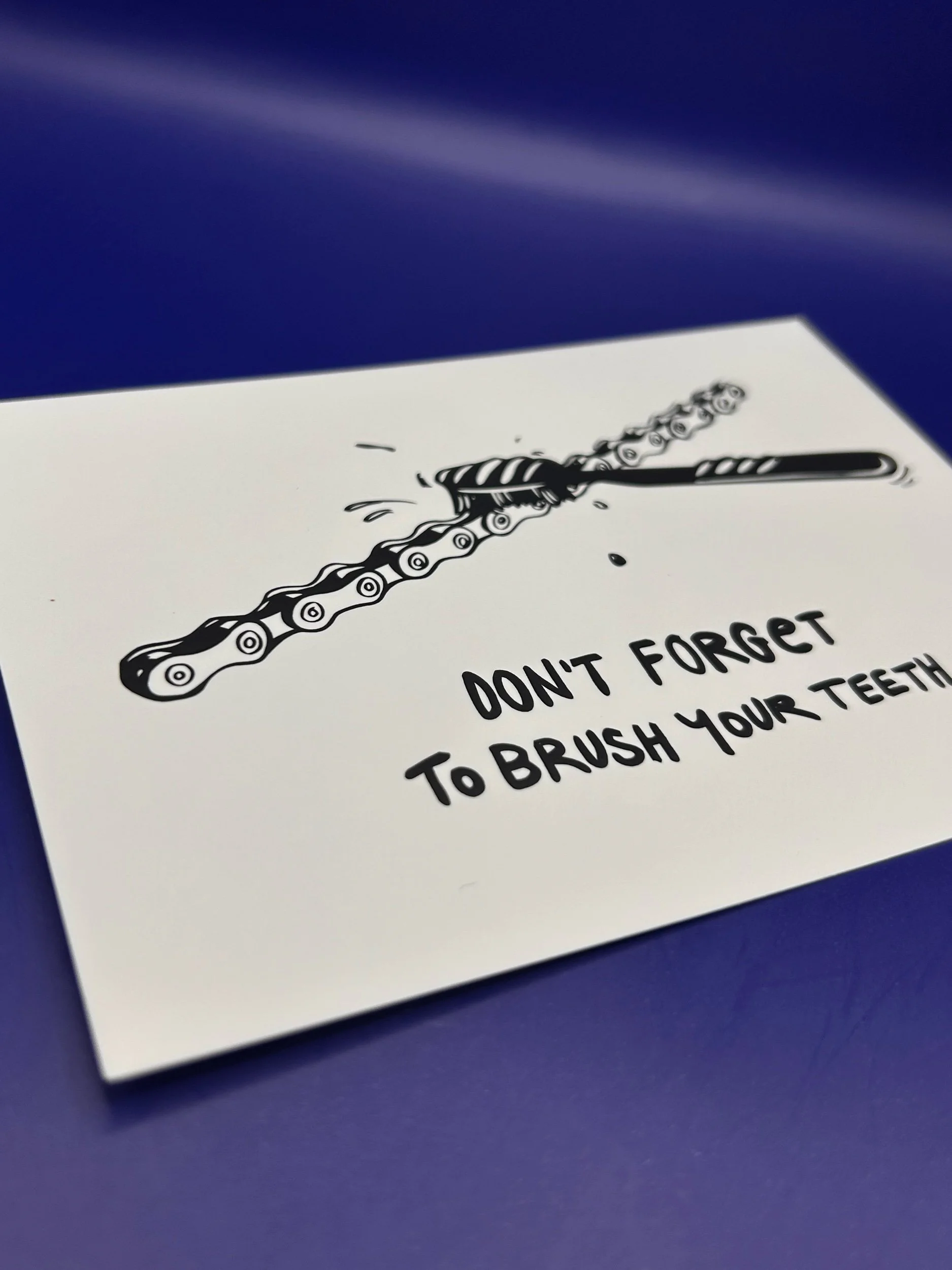 Diese Postkarte ist eine freundliche Erinnerung von mir, dass du nicht nur abends deine Zähne putzt, sondern dabei auch mal an die Kettenglieder deiner Fahrradkette denkst. Denn grade im Winter muss der Antrieb wirklich leiden. Schnee, Regen, Winterdepression, Streusalz machen der schmierige Metallschlange echt zu schaffen.